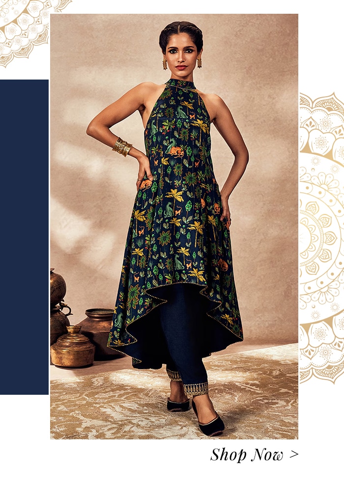 Masaba brings tropical whimsy to festive mornings with this printed kurta set. Embellished with kinari lace and tailored with an asymmetric hemline, it is breezy yet celebratory. Embroidered pants complete the look, offering comfort for long rituals. Designed for early morning Diwali pujas in New Jersey, this set is proof that Diwali Indian outfits don’t always have to be heavy or ornate—sometimes fresh, light, and effortless is the chicest choice.