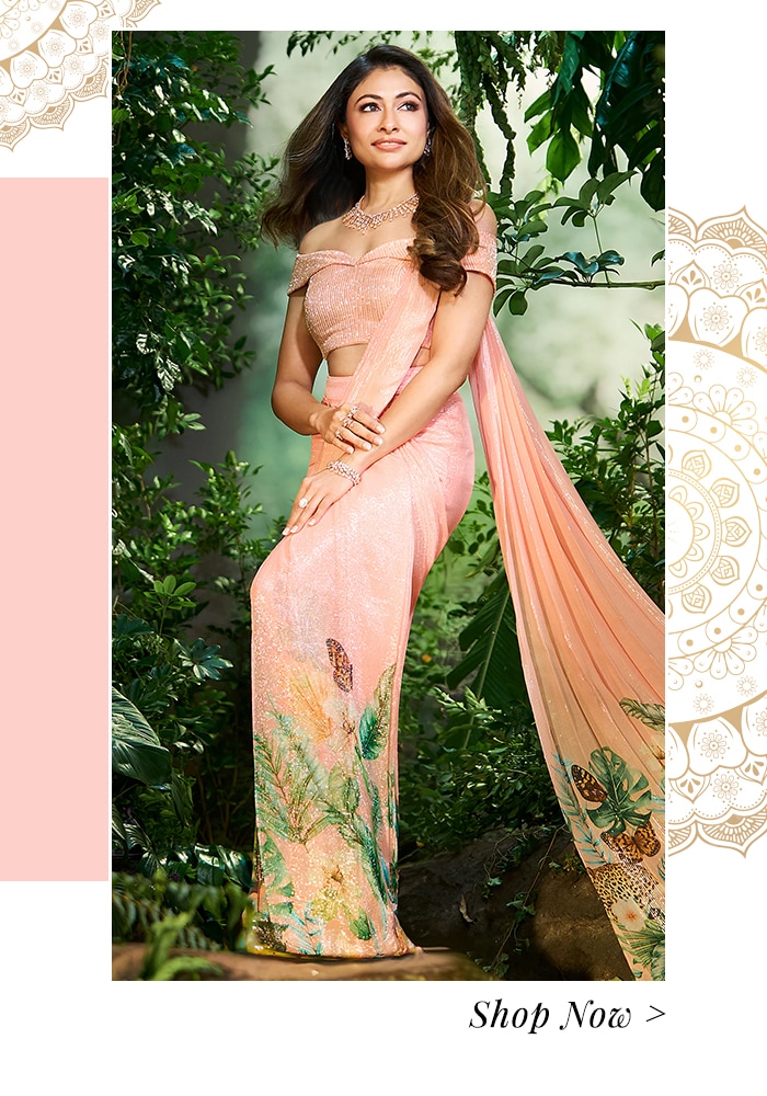 Aza x Shilpa Shetty Kundra’s ROAR collection serves unapologetic glamour with this off-shoulder pre-draped saree. The pink lurex base shimmers with stripes, while botanicals, animals, and butterflies dance across the fabric. Paired with an embroidered modal satin blouse, the look is a celebration of maximalism. Ideal for Diwali Jersey City parties, this is fashion that roars—a piece that merges traditional Diwali attire with unapologetically bold, contemporary energy.