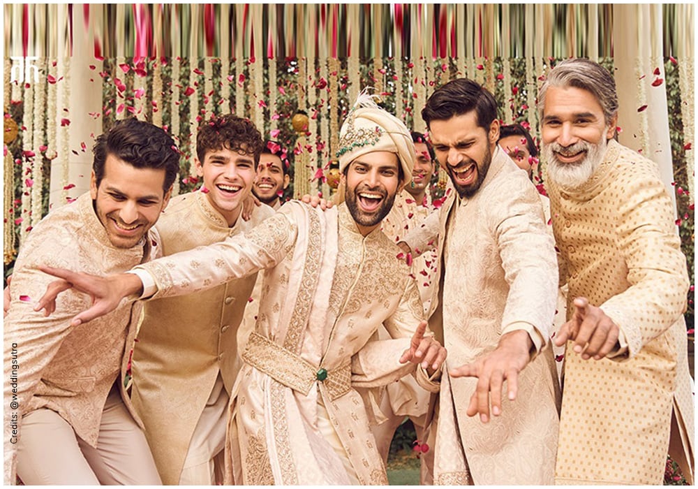 Coordination doesn't mean you have to wear the exact same color. You can match the color of your pocket square or the embroidery on your sherwani to her lehenga. Another option is to choose outfits from the same color family (e.g., if she wears peach, you can wear a darker rust). You can also coordinate based on the style—if she’s in a traditional lehenga, a sherwani would be a great match.
