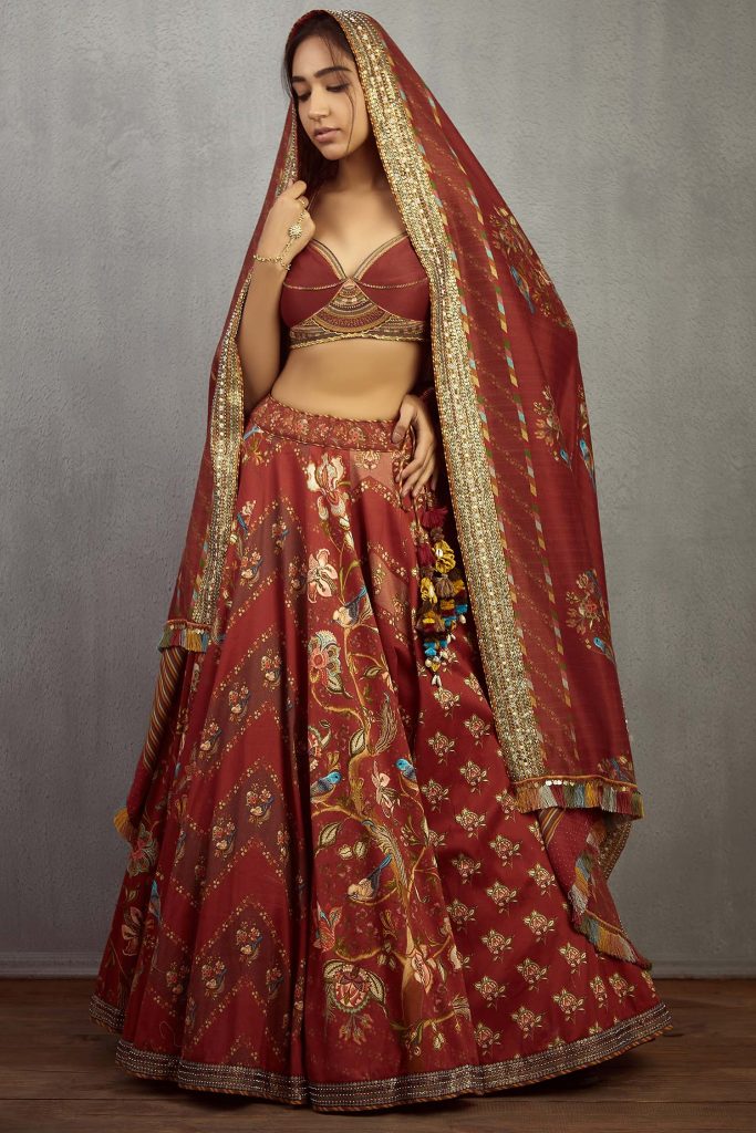 Need some inspiration to wear prints on your wedding day? Make it happen by opting for this chanderi printed lehenga set with floral and bird motifs with a sweetheart neckline.
