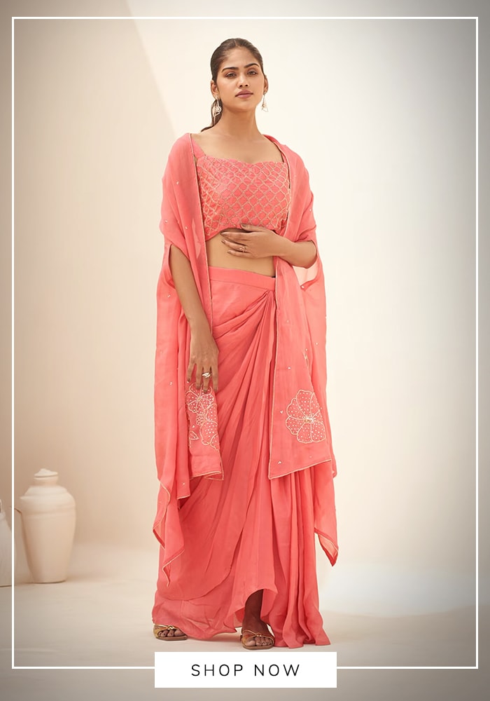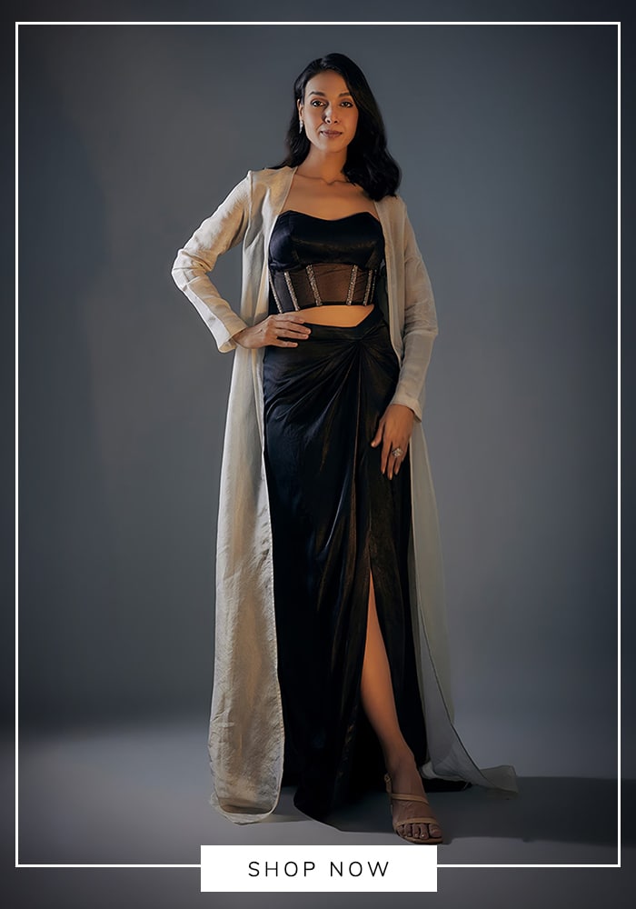 - A swap for a predraped saree : The draped skirt could shadow the fall of a saree without the pleats. The jacket and that neckline mimics the blouse perfectly and replaces the blouse and pallu combo. So next time you wish to ditch the saree, you can do so comfortably. Accessorize with a gold or silver clutch to give a feeling of grace with elegance.