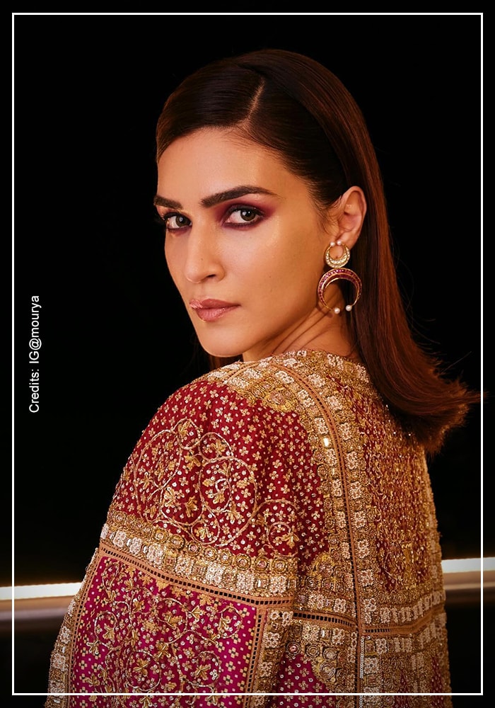 Ananya Pandey, not too long ago was seen in an Arpita Mehta sharara set with a matching mirrorwork embellished embroidered jacket, for a prewedding celebration in Dubai. A three-piece outfit, perfectly proportional for its silhouette, outward, loud and unapologetic. You’d definitely catch the spotlight, were you to wear it to an evening celebration that has a festive touch to it. Next time there is a Diwali party, don’t hesitate to glam up in that mirror work statement embroidered jacket.