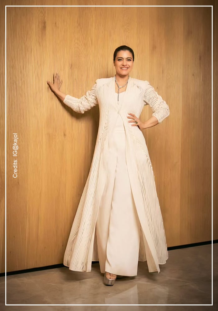 Kajol’s recent appearance in a taupe linear white embroidered jacket was a minimalist dream. Embroidery on the jacket was with lineation which not only held the silhouette, but also defined it. Designed by Rohit Gandhi and Rahul Khanna, this long jacket can be worn for parties where you want to look effortlessly well dressed. This could work as a perfect alternative when you want a modern touch to your outfit and want to step away for a moment from heavier works of embroidery, say, a zari work or aari work piece, but want to look put together without compromising on style. This jacket can elevate your look, over jumpsuits or a long gown. You could go for similar, minimally sequined outfits that serve the same looks but with slight elevation. There are similar styles you can try at AZA fashions, which will elevate your look.