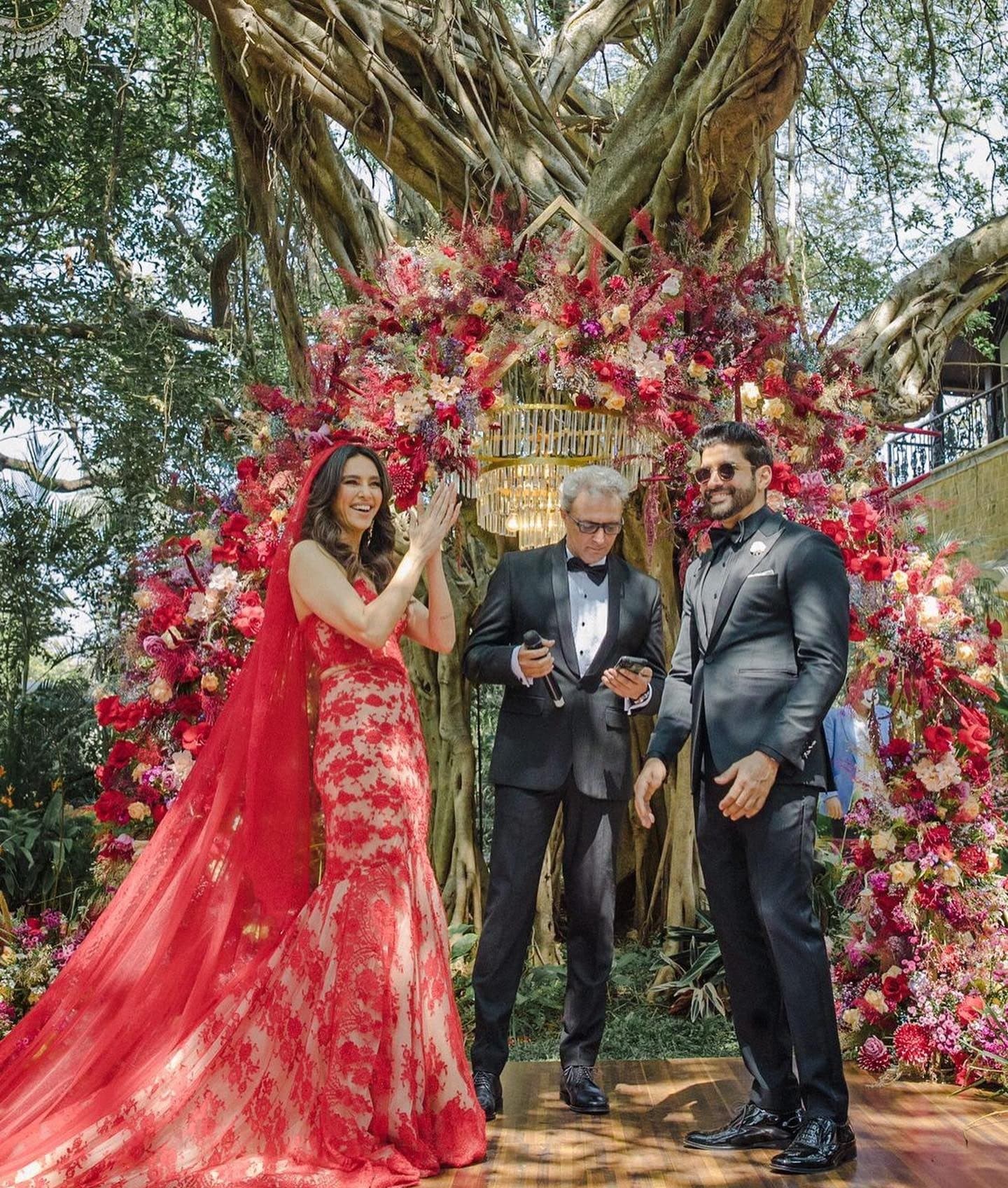 A lot of celebrities have been opting for gorgeous lehengas and sarees that make you want to get married even if it's without a groom, we always welcome and love a fresh change in the bridal trousseau and wardrobe! The celebrities set trends like no other and people often look up to them for the latest styles in the world of fashion. Ditching the traditional lehengas and heavy jewellery, Shibani Dandekar looked absolutely ethereal in a custom-made gown by Monica Shah from Jade By Monica And Karishma. Farhan Akhtar looked dapper in an all-black tux by Govinda Mehta and the couple looked ecstatic in the intimate setting.
