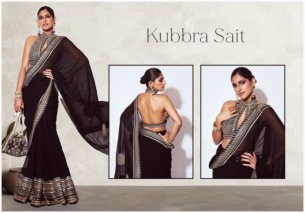 5. Experience sophistication with Kubbra Sait's ready-to-stitch lehenga saree. It is hand-embroidered in sequins and cut dana, paired with a chiffon saree, showcasing exquisite craftsmanship and intricate work, making it a timeless choice for special occasions.