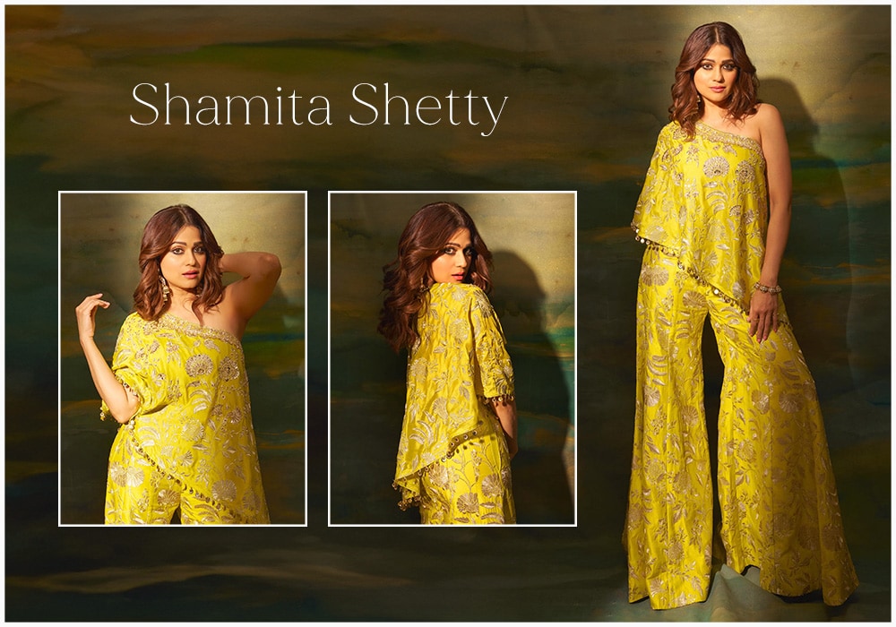 4. Get ready to rock any day with Shamita Shetty's stylish and comfortable one-shoulder look. The outfit features an enhanced neckline and embroidered flared pants that complete the ensemble, giving you a feminine feel that is perfect for any occasion. With this outfit, you will radiate confidence and effortless style.