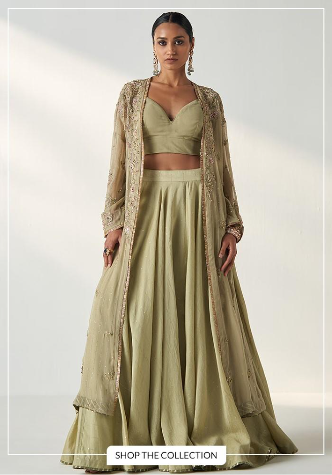 Layering is a key trend in modern ethnic wear. This style pairs a lehenga skirt with a long or short jacket instead of a choli. The jacket can be heavily embroidered or simple, depending on the occasion.
