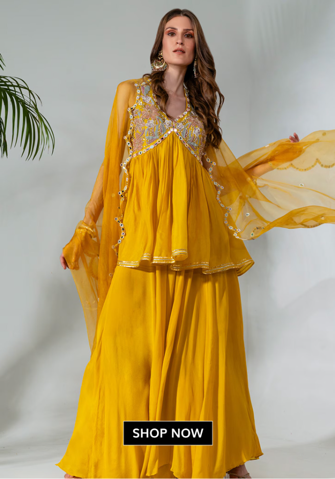 - Peplum Tops: Pair your sharara pants with a peplum-style kurta for a modern and flattering silhouette. This is one of the most sought-after trendy Haldi looks.