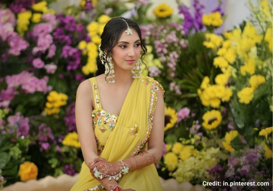 - Ruffled Sarees: A pre-draped ruffled saree is a trendy Haldi look that is both stylish and hassle-free. It adds a touch of drama and fun to your ensemble.
