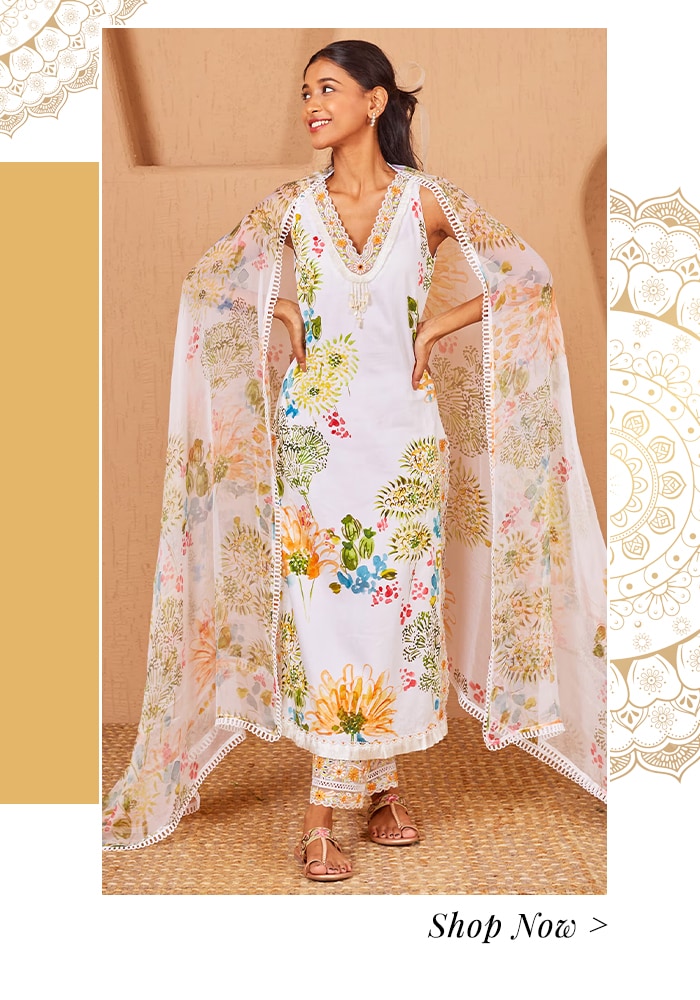 We hope you enjoyed traversing through our list of Haldi outfit ideas. For those who prefer to go for a quintessential yellow Haldi outfit, we suggest selecting the silk satin saree. Alternatively, if you want to try something different yet traditional, choose the white hand-painted saree. However, if you would rather have a completely edgy look, the kaftan co-ord set stands as the ideal fit.