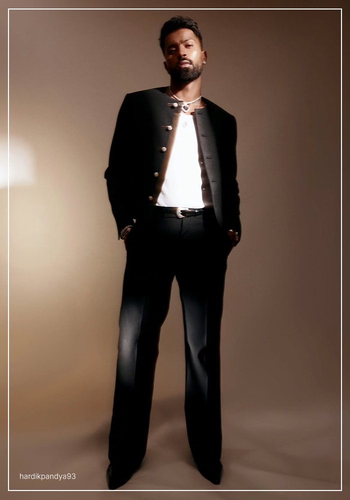 - Designer Edge: At a Vogue India gala, Pandya sported a black pantsuit from Celine. Instead of a traditional shirt, he paired it with a white tank top. The look was elevated with intricate diamond jewellery, including a heart-shaped necklace and diamond strings on his arms, showing his flair for blending masculine and feminine elements.