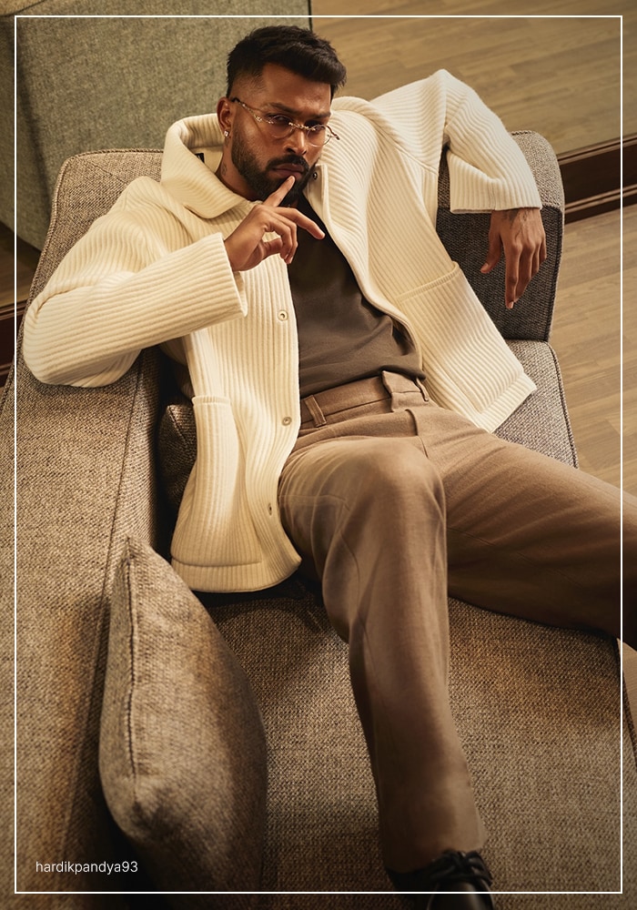 - Cardigan Comfort: Pandya proves that comfort can be incredibly stylish. An ivory ribbed collared cardigan paired with relaxed-fit tan trousers creates a soft yet sophisticated look. It’s a perfect example of modern, understated luxury.