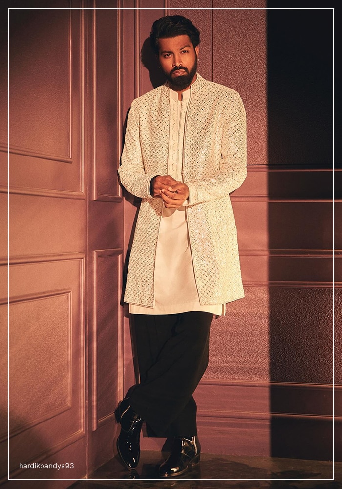 - Ivory and Geometric Grace: In another stunning appearance, he wore an ivory embellished sherwani set by Manish Malhotra. The sherwani featured geometric motifs and was paired with an embellished kurta and black pants, creating a striking contrast that was both traditional and contemporary.