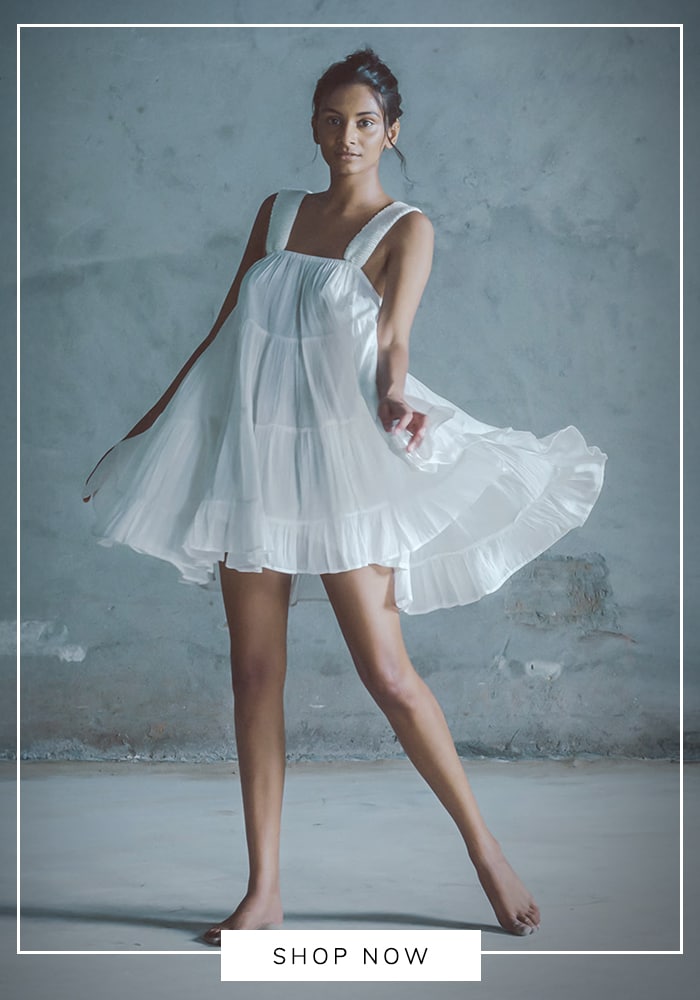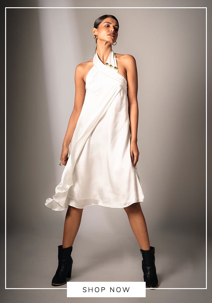 You can channel this timeless allure by browsing Aza Fashions for white cocktail dresses featuring halter necklines or fluid, pleated skirts. Look for designers like Gauri & Nainika who often play with feminine silhouettes and classic cuts that mirror this breezy elegance.