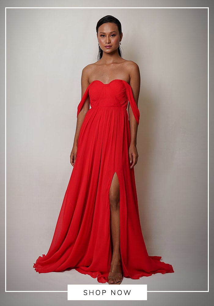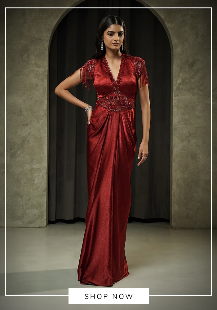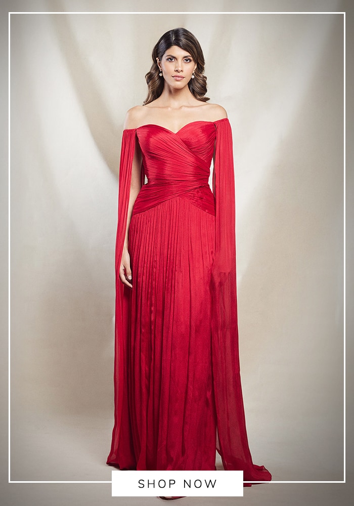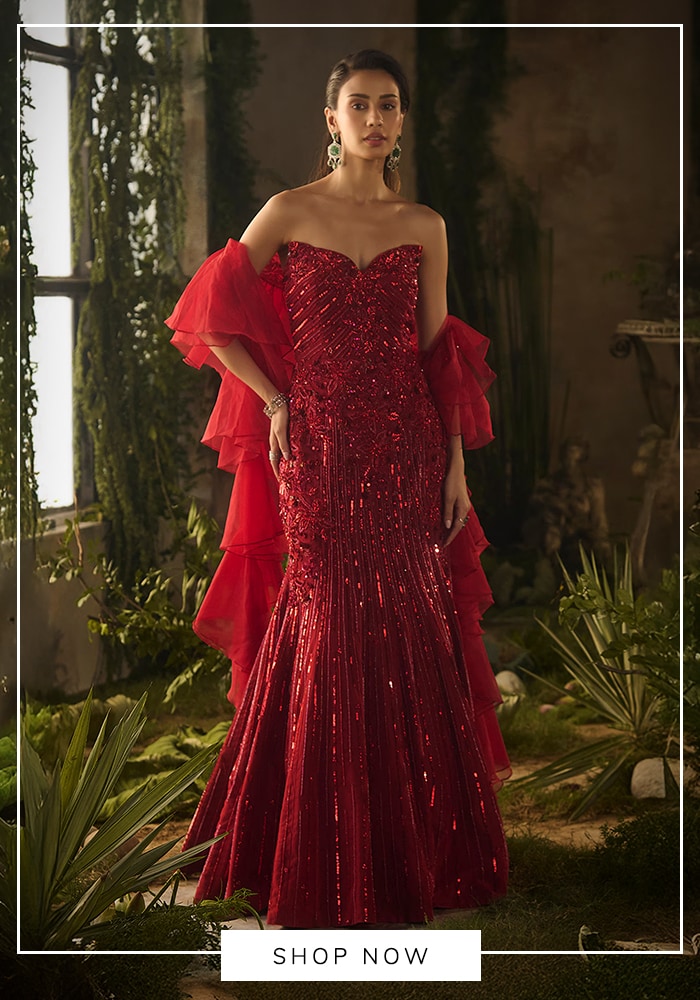 To find your own "Opera" moment, browse Aza Fashions for red off-shoulder gowns with structural draping. Designers like Amit Aggarwal often create sculpted, vibrant red pieces that command attention and exude confidence.