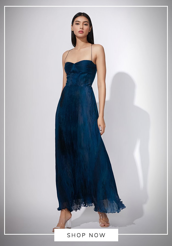 Embrace the slip dress revival by searching for satin or silk gowns in jewel tones on Aza Fashions. Look for minimalist designs with spaghetti straps or cowl necks from brands like Dash And Dot to capture that sultry, effortless vibe.