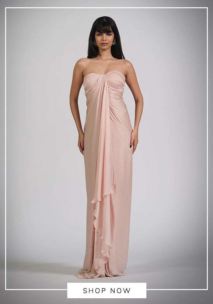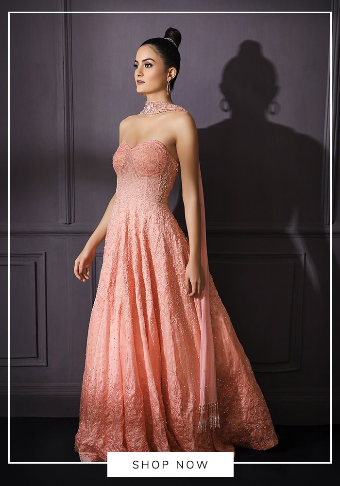 Soft pastels and romantic cuts are always in style. Search for peach or blush pink gowns with ruched bodices on Aza Fashions. You might find similar dreamy aesthetics in the collections of designers like Astha Narang, who excel in creating soft, feminine silhouettes.