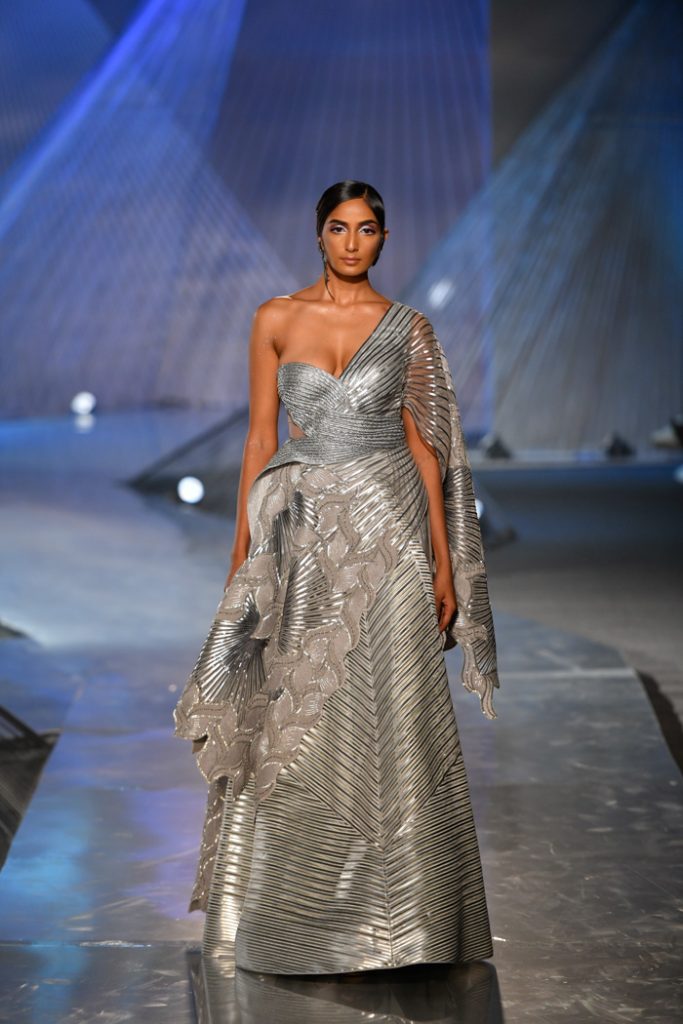 Futuristic and metallic are two terms that can describe the steallar collection of distinctive silhouttes and colors that designer Amit Aggarwal presented at the India Couture Week 2018. Rightly termed ‘Crystalis’, the collection has complex geometric embellishments and corded detailing that highlighted the designer’s signature polymer work.