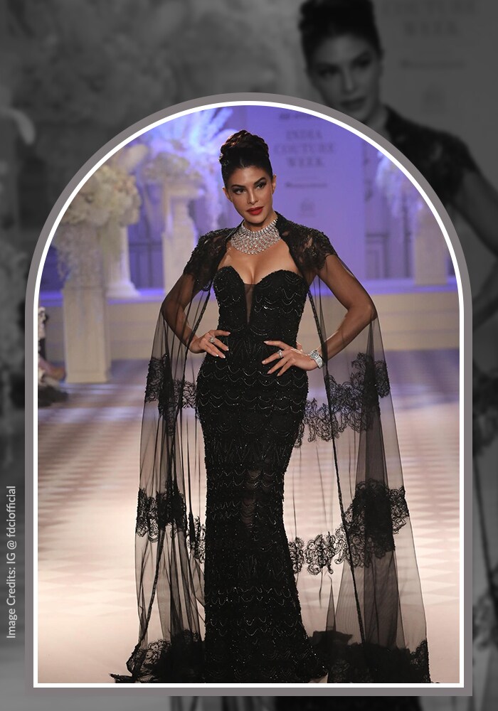 Jacqueline Fernandez closed the show in a black corseted gown with a sweetheart neckline and an elegant mesh cape.