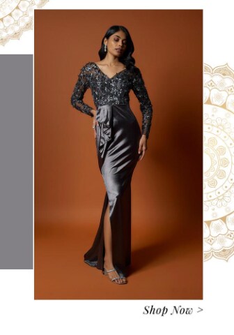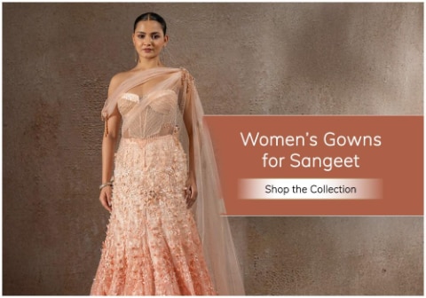 - Styles: This is the perfect occasion for dramatic silhouettes. Look for women gowns for sangeet with flair, like a mermaid cut or a ball gown skirt. An off shoulder or one shoulder neckline adds a contemporary edge.