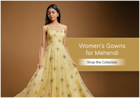 - Styles: Choose gowns with simpler silhouettes and minimal floor sweeping elements. A line gowns or those with a high low hem are practical yet stylish. Look for women gowns for mehendi and haldi that are beautiful but fuss free.
