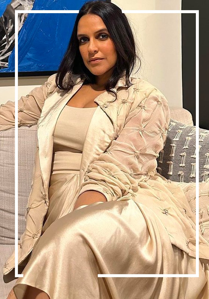 This beige co-ord set is everything that sets the word elegance in the right place. In a post that appreciated talent, conversations and art, Neha was seen dressed in a bespoke 3-piece co-ord set. The monochrome outfit is everything diva!