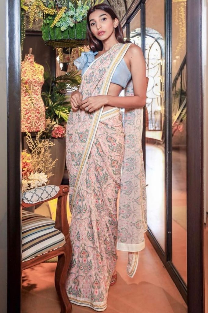 This outfit by Sonam Luthria takes contemporary draping a notch up. The floral embroidered piece is pre-draped in such a way that it is also a half-dhoti. This sunny number is appropriate for a classy cocktail party. To ace the look, you need to style it with some contemporary jewellery, preferably a maangtikka or earrings. Add on a clutch and sky-high heels to complete the look.