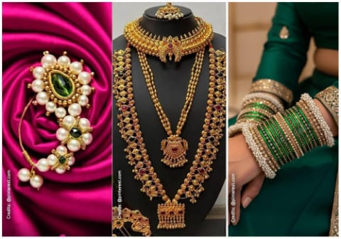 - Green Bangles: Green glass bangles are considered auspicious for married women in Maharashtra and are almost always worn with a Nauvari saree.