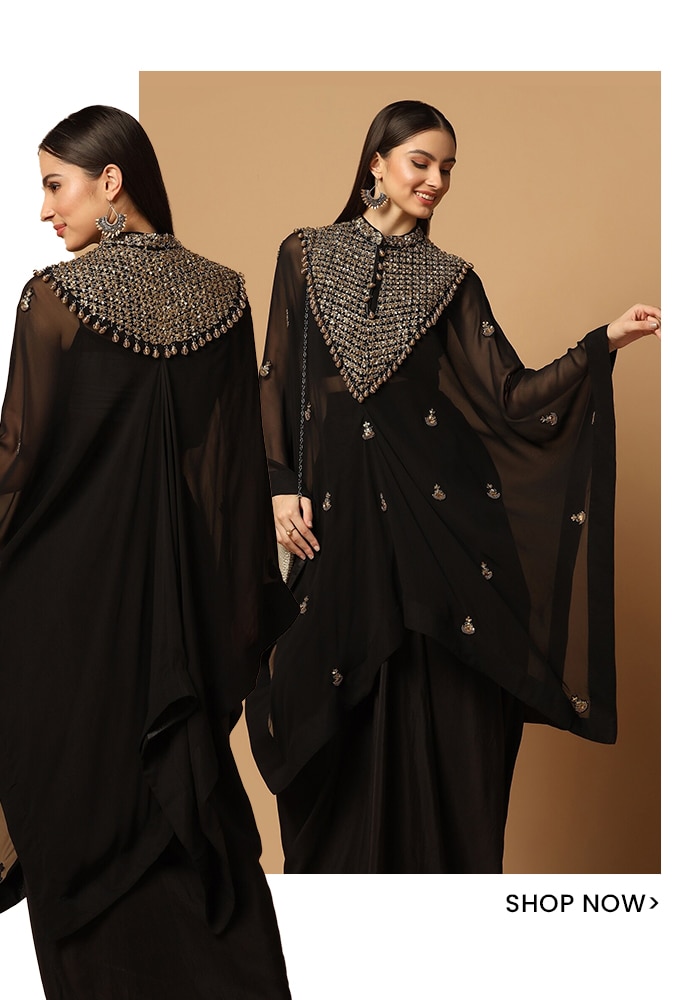 Move over dresses, gowns or even sarees, It’s times for kaftans to take the limelight at cocktail parties. Styled over a draped skirt and top, this sheer kaftan cape from Two Sisters By Gyans adds a trendy appeal to the overall classic attire. Whilst the all-black hue and the gold Zardozi and Dabka embroidery on the yoke offers a glam allurePerfect for wedding parties and cocktail soirees, shop the look today!