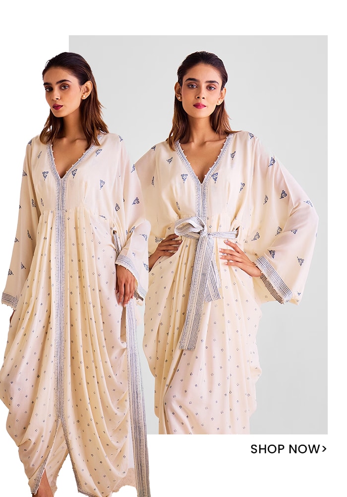 Ever confused between kaftans and indian dresses, take cue from this off-white kaftans dress by Cotton And Clay. The dhoti pattern of the dress and the tie-up belt create an elegant merge of western and Indian influences. The pleats on the kaftan add a structured allure, while the delicate floral and geometric prints radiate elegance. Sophisticated yet comfy, this outfit is perfect for brunches and casual events.