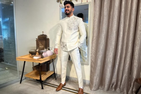 Saif looked extremely dapper in a beige sherwani and white churidar. He styled his minimal-yet-impactful outfit (which balanced Kareena's detailed number) with a gold turban and black footwear. This is how they always look good together, 1) great looks and 2) complementing outfits. Take notes.
