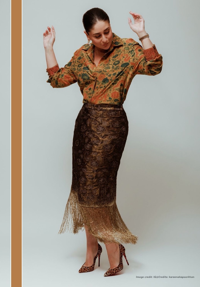 Beyond this ivory moment, Kareena Kapoor Khan has consistently championed Indo-Western silhouettes that balance heritage with modern design. One striking example is her look in Namza Couture, where she paired a patterned shirt with a brown fringed, embroidered skirt. The mix of sharp tailoring and artisanal texture created a look that felt rooted yet contemporary, proving her instinct for unconventional pairings.
