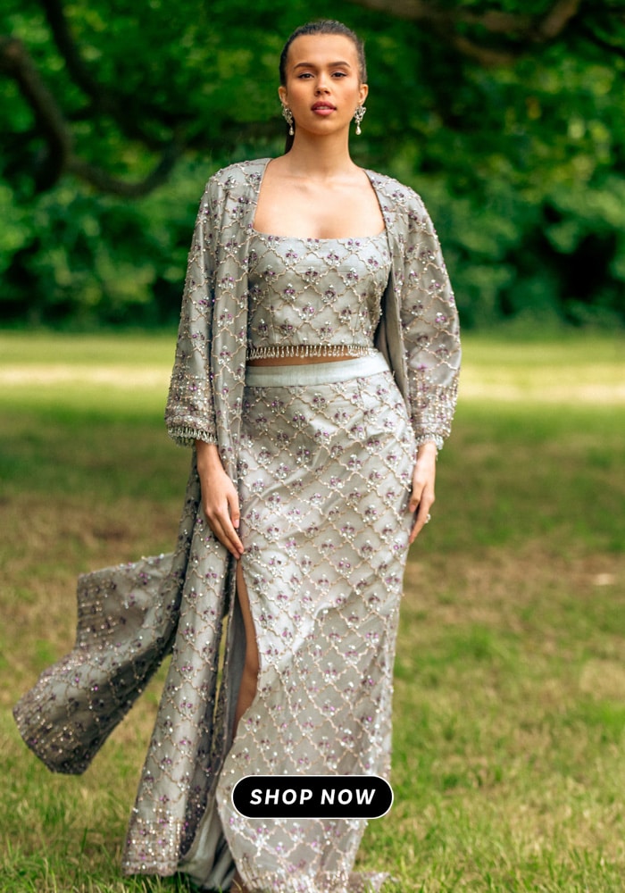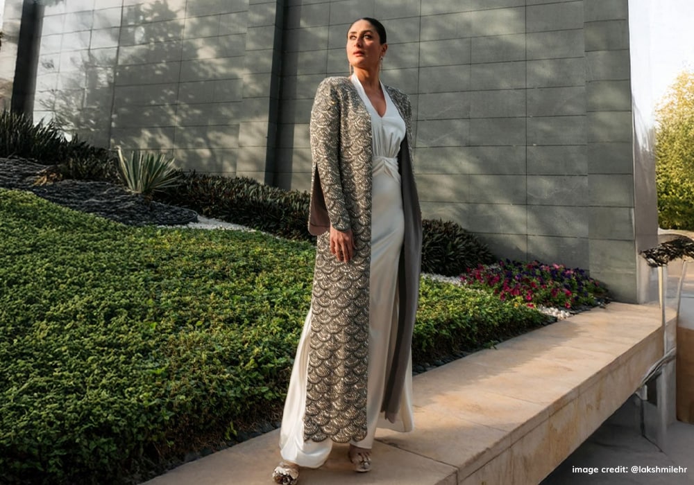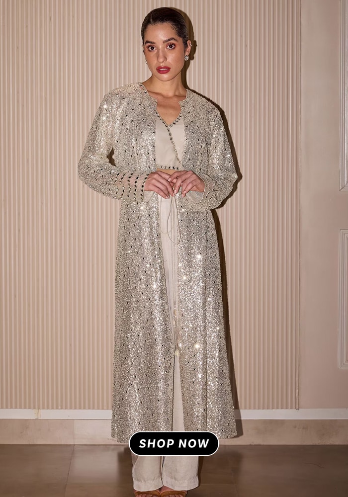 If Kareena’s ivory scallop-embroidered jacket caught your eye, Aza Fashions offers a curated selection of silver and ivory embellished jackets that echo the same design philosophy. Look for longline silhouettes with intricate embroidery, delicate beadwork, or textured detailing that can be layered over fluid dresses, jumpsuits, or even tailored separates. These pieces bring the same sense of movement, craftsmanship, and quiet drama, making them ideal for evening events, celebrations, or modern festive dressing.