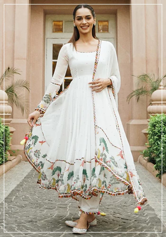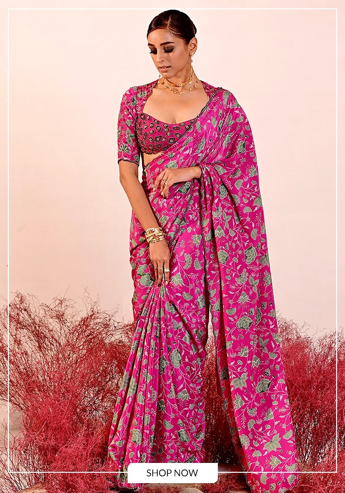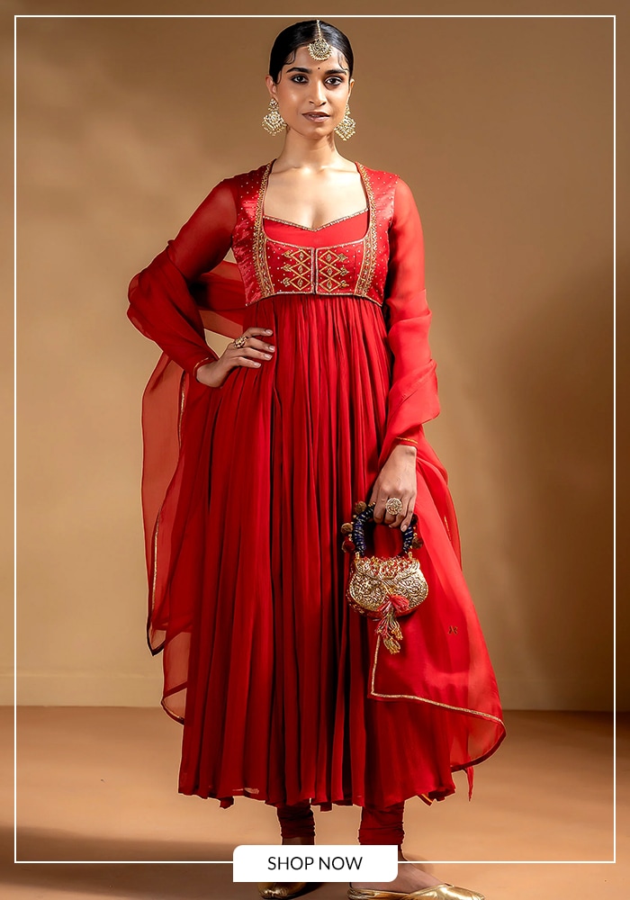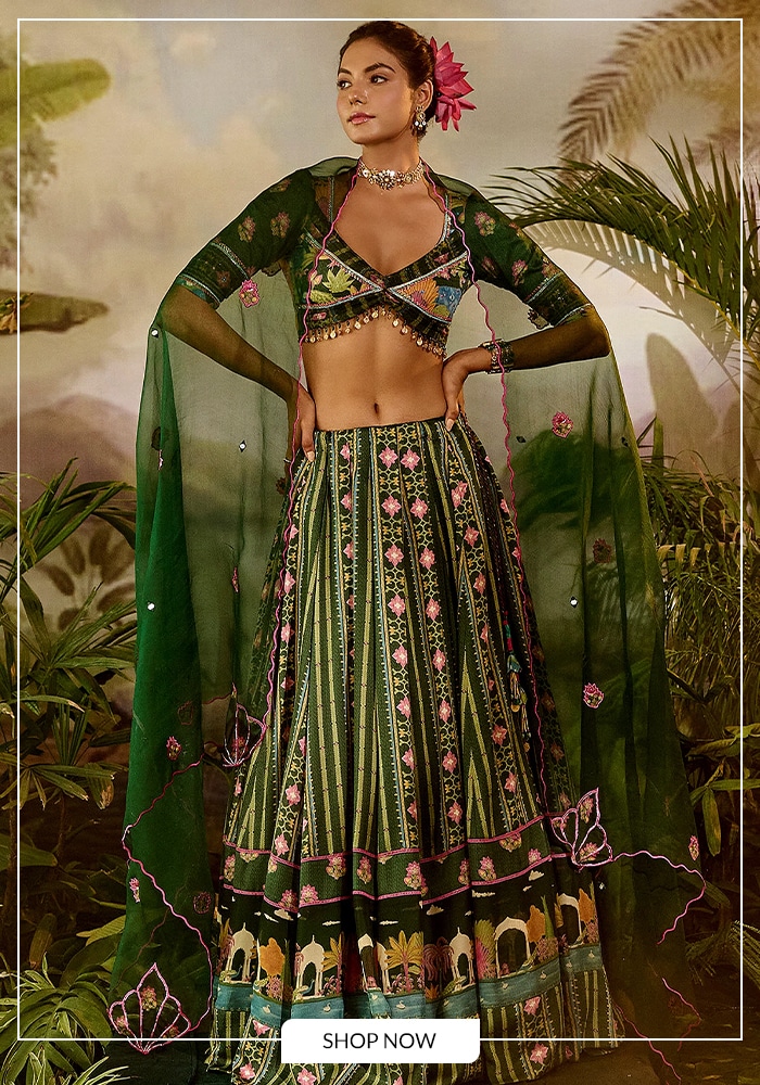 You will find a strong focus on Anarkali sets, sweeping lehengas, elegant sarees, and modern co-ords. The label frequently uses lush floral prints and Bandhej-inspired motifs to create visual interest. Rather than heavy zardozi, they opt for soft, delicate embellishments that catch the light gently.