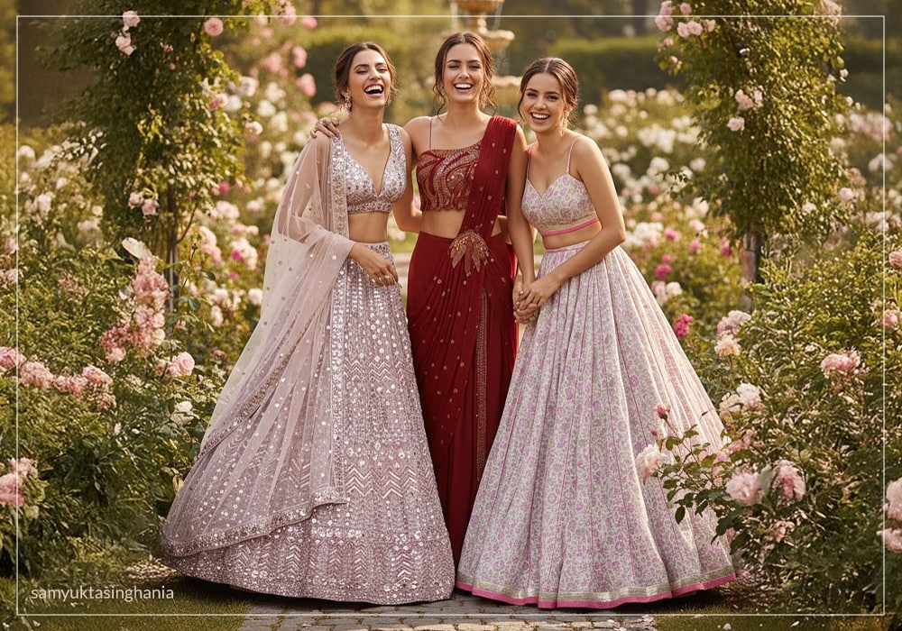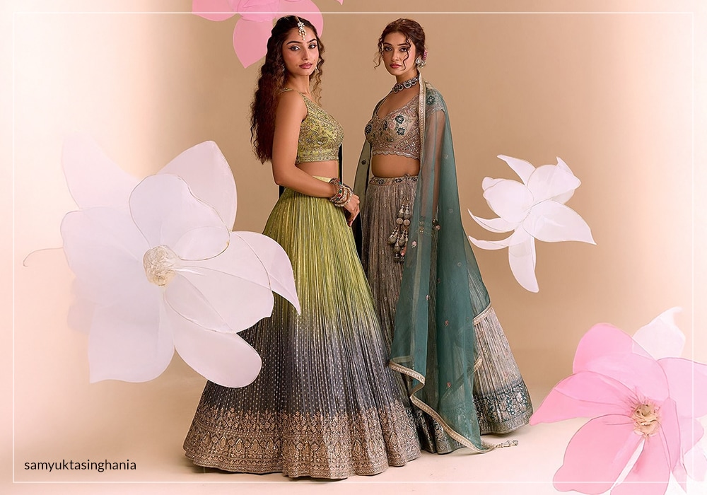 As her brand grew, so did her collections. Samyukta expanded her creative universe to include lehengas, sarees, gowns, and contemporary fusion silhouettes. Through this expansion, her signature style became unmistakable: refined Indian wear that carries the warmth of heritage crafts and the lightness of modern design.