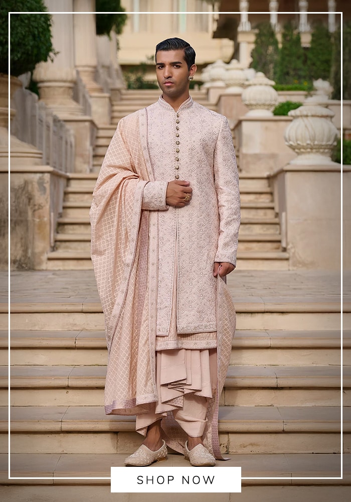 The Ivory Silk Sherwani: A timeless choice for grooms, this piece features subtle embroidery all across. Punctuated with a blush pink stole,it is perfect for weddings.