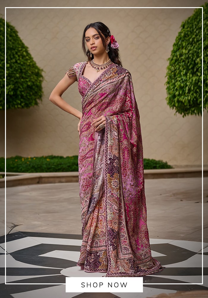 Purple Kashida Saree: Immerse yourself in the artistry of Tarun Tahiliani with his signature Kashida saree. A masterpiece that celebrates intricate craftsmanship and timeless grace, the saree is adorned with exquisite Kashida embroidery inspired by traditional Indian motifs.