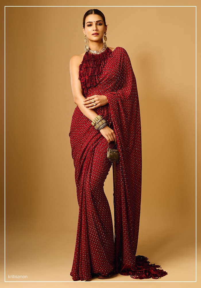 For another promotional event, Sanon chose a vibrant red pre draped saree from designer Anita Dongre. This 'Anuka Ajrakh' saree celebrated traditional Gujarati hand-block printing, crafted with eco-friendly dyes. The ensemble was elevated with sequin highlights and a dramatic fringe on the pallu. Paired with a halter-neck fringe choli and accessorized with handcrafted gold earrings and bangles, the look was a masterclass in modernizing heritage crafts.