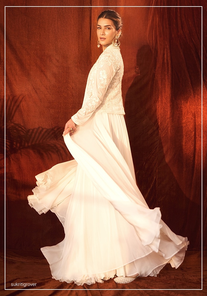 Kriti Sanon exuded grace in an ivory anarkali paired with an embroidered jacket by designer Rohit Bal. This cohesive and minimal look played with tonal dressing, using a mix of textures to create visual interest. The long, flowing anarkali provided a beautiful base for the exquisitely embroidered jacket. With her hair styled in a neat bun and accessorized with large statement earrings, she proved that elegance often lies in simplicity.