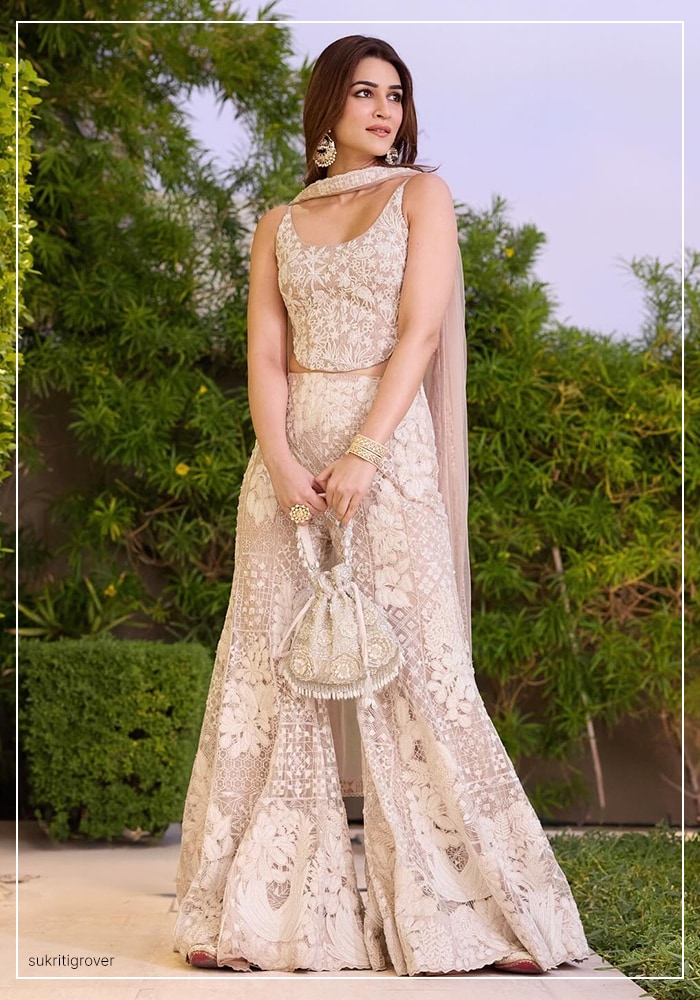 Showcasing her love for contemporary Indian festive wear, Kriti stunned in an ivory geometric sharara set by Mishru. This three-piece outfit, crafted from delicate tulle, included a corset top, sharara pants, and a dupatta. The entire set featured intricate hand-embroidered floral and geometric patterns with shimmering accents. She completed the look with a matching embroidered potli bag, providing perfect inspiration for modern wedding guest attire.