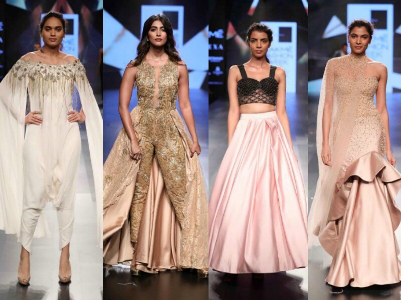 Sonaakshi Raaj spread her magic on the runway with her collection of evening wear which was a blend of traditional and modern styles on the final day at Lakme Fashion Week. Sonaakshi, known for her popular sari gowns, loves marrying varied silhouettes and cuts which was prominent in her collection of fusioned outfits this year too. From blacks and silver to peaches, seeing the collection unfold was sheer delightful. Pooja Hegde closed the show in a gold embellished jumpsuit with an attached trail.