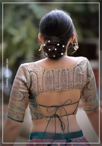 A beautifully designed back can be just as impactful as the front. The backless blouse, held together with delicate strings (doris) or straps, is a timeless way to add a touch of sensuality to your Pattu saree look.