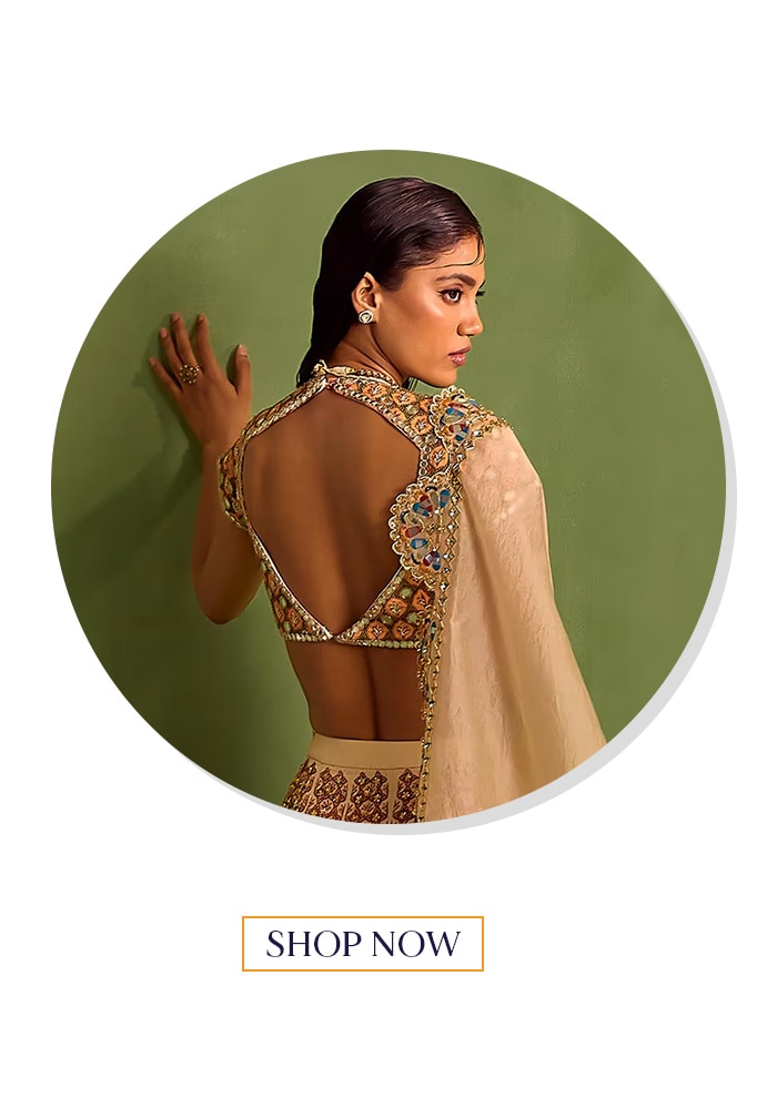 People are going to notice your outfit from all sides, so make sure your attire looks stunning from all angles. For a head turn appearance, you need to pay attention to your back design too. You can choose between an open, keyhole, or low-back design. If you want a covered back, you can go with an embroidery that complements your indian lehenga for the best effect.