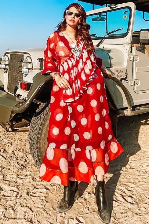 Natasha Luthra sizzles in this clamp-dyed polka-dotted dress by Ka-Sha. Since we can't have enough of billowy dresses (especially for this unseasonal heat), this serves as a must-have. We'd like to wear minimal tiered necklaces with dainty pendants with this style, what do you think?