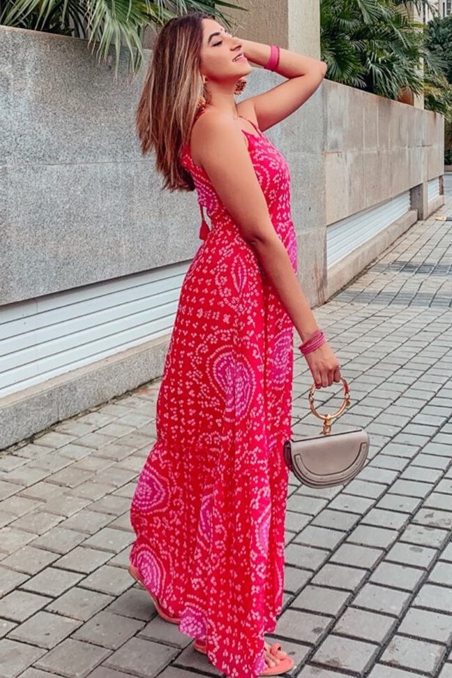 Maxi dresses dipped in bright dyes? Yes, please! Pick pretty bandhani pieces that you can definitely wear during festivities. Style it just like Aashna, who paired classic danglers and bangles for a traditional look.