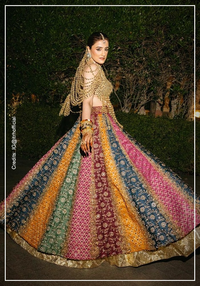 Actress Nupur Sanon looked radiant in a custom creation by ITRH for her wedding festivities. Her outfit showcased how mirror work can be both sophisticated and celebratory. Similarly, Alekha Advani, for her pre wedding, chose the exquisite Nagma Lehenga from ITRH. The intricate mirror detailing on her outfit was a perfect example of modern bridal glamour.