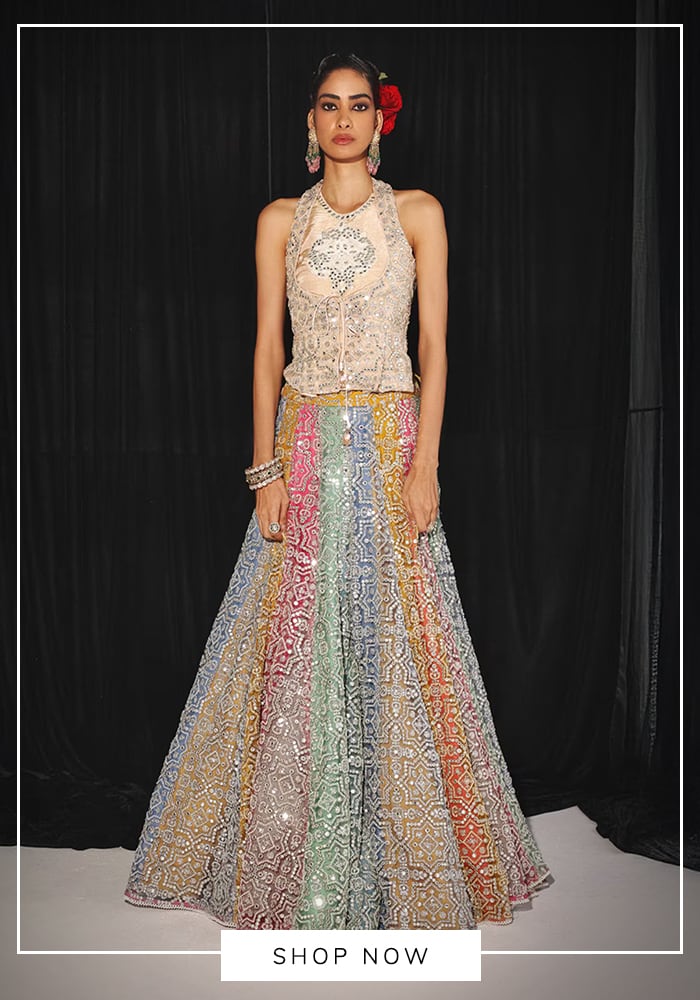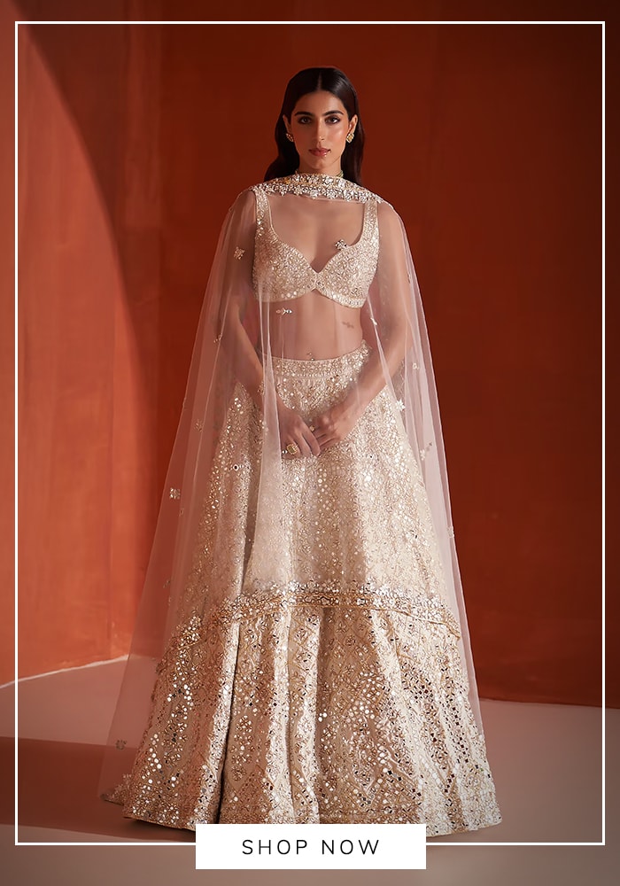 - Vvani by Vani Vats: This label is celebrated for its elegant and refined take on mirror work. The designs often feature delicate patterns and sophisticated silhouettes, making them a favorite for brides seeking a chic and glamorous look for their sangeet or cocktail party.