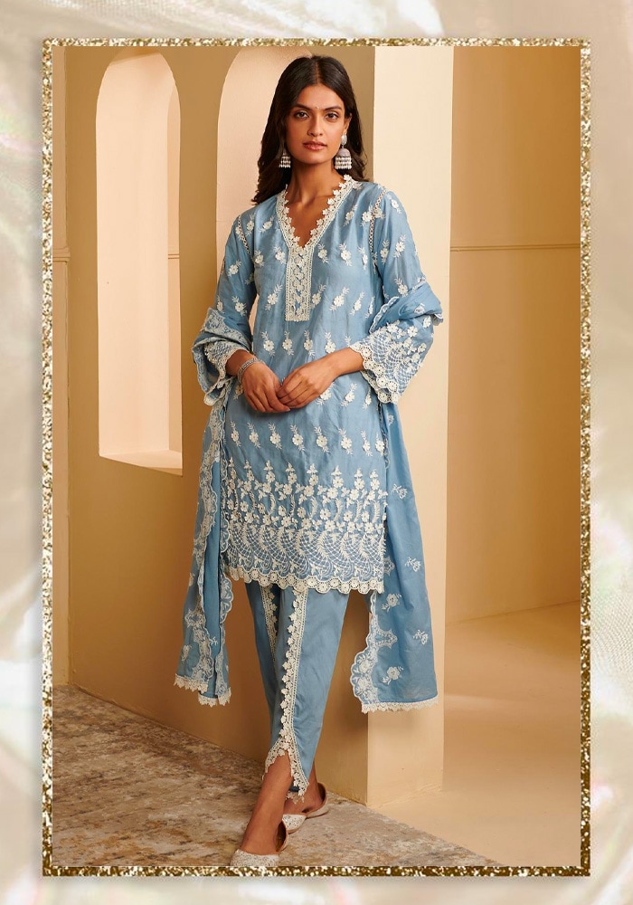 The ethereal beauty of Tencel luxe organza straight-fit kurtas never runs out of the limelight in case you are attending puja, mehendi and haldi rituals. In addition to this, this label's collection is filled with a variety of options for occasional wear. Moreover, the roomy monotone colors of the intricately worked designs captivate the onlooker's attention. It is an apt choice for any intimate celebrations that are on your radar.