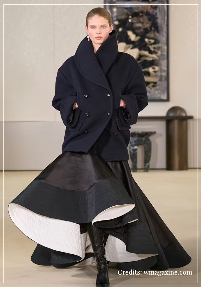 Marc Jacobs opened with an off-calendar show that turned nostalgia into high drama. Oversized knits, sharp suiting, and bold color pops set the mood, while Sofia Coppola and Julia Fox drew major front-row buzz. The floor-length silver puffer with exaggerated shoulders instantly became the season’s talking point.
