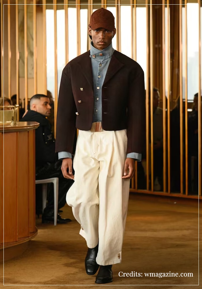 Commission delivered understated edge through crisp tailoring and fluid shirting. The aesthetic leaned into quiet cool with sharp precision. A leather cropped jacket with contrast silver hardware stood out as the collection’s strongest statement.